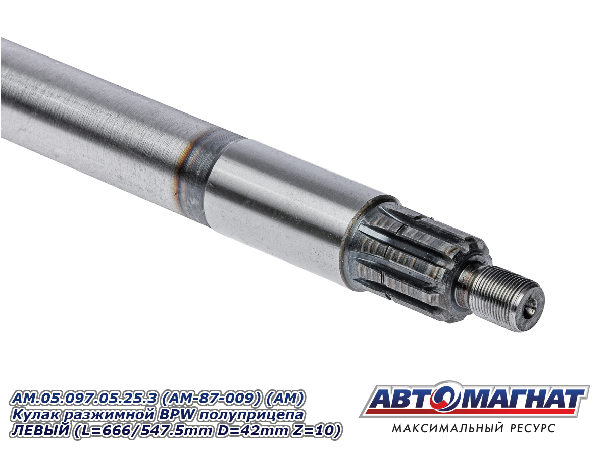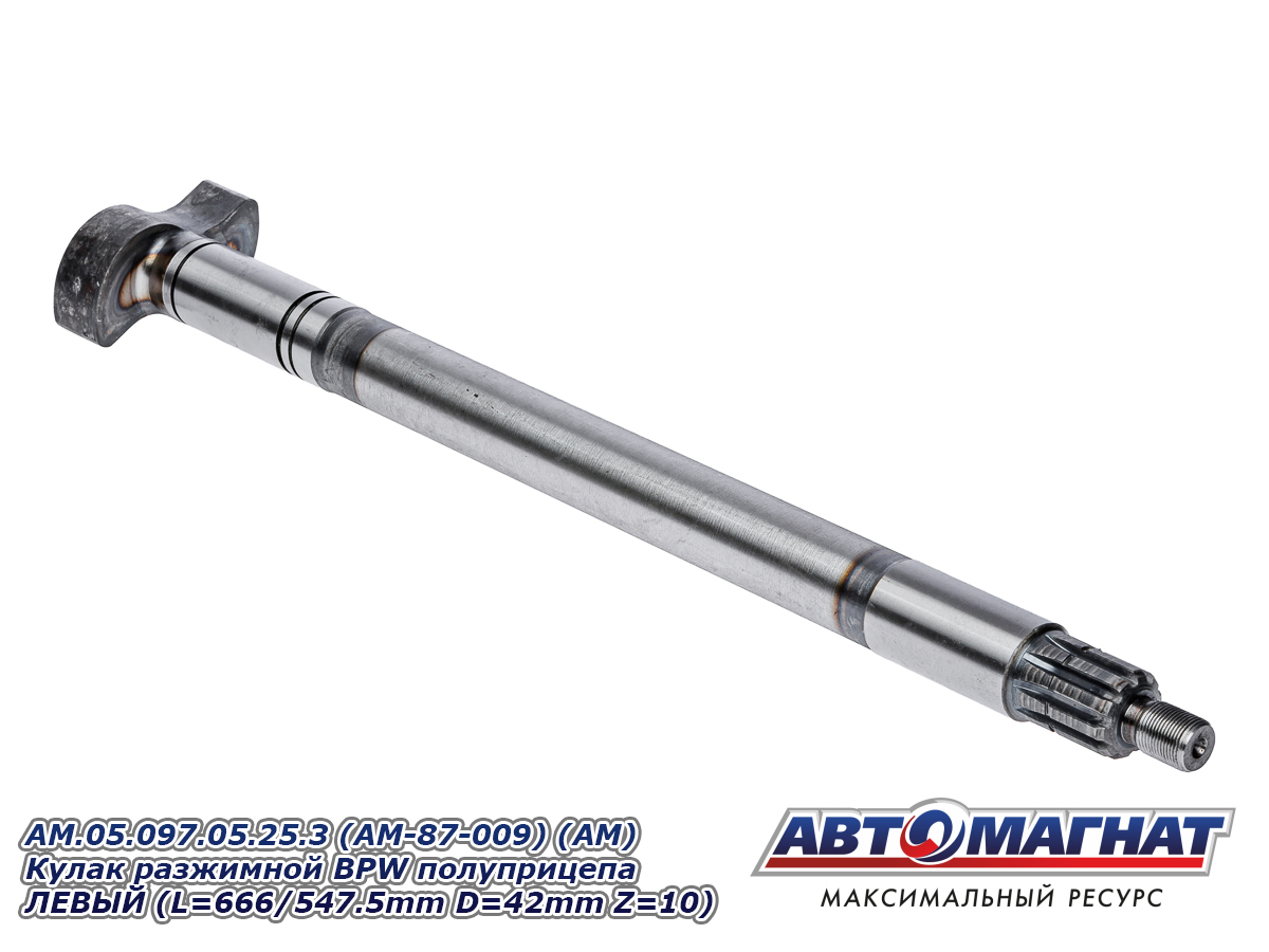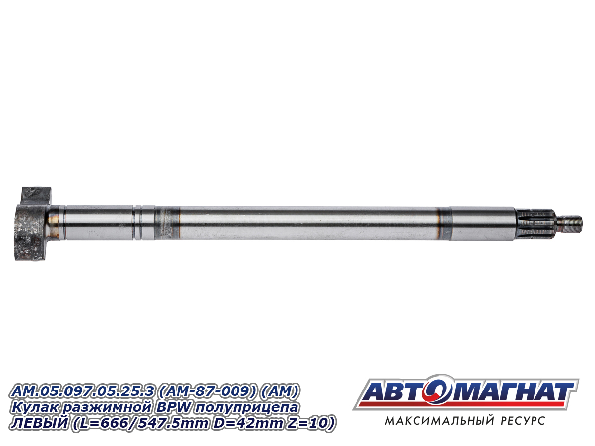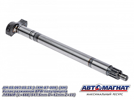 Кулак разжимной (вал тормозной) BPW полуприцепа колодок тормозных ЛЕВЫЙ SN3620/4212/4218/4220/4222 (L=666/547.5mm D=42mm Z=10) AM.05.097.05.25.3 (AM-87-009) АВТОМАГНАТ