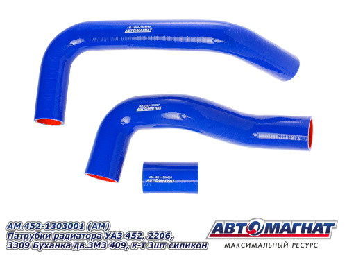 AM.452-1303001 (АМ) Патрубки радиатора УАЗ 452, 2206, 3309 Буханка дв.ЗМЗ 409, к-т 3шт силикон 1 323.37 ₽